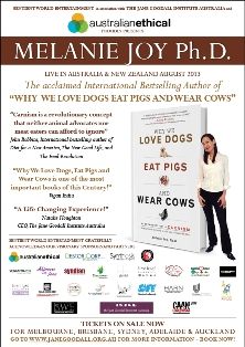 Dr Melanie Joy is travelling around Australia/New Zealand between August 18th – 28th to support her revolutionary book and to help us understand the meaning of carnism. Rather then telling us why we shouldn’t be eating meat, Dr Joy helps us to explore the reasons why we do.